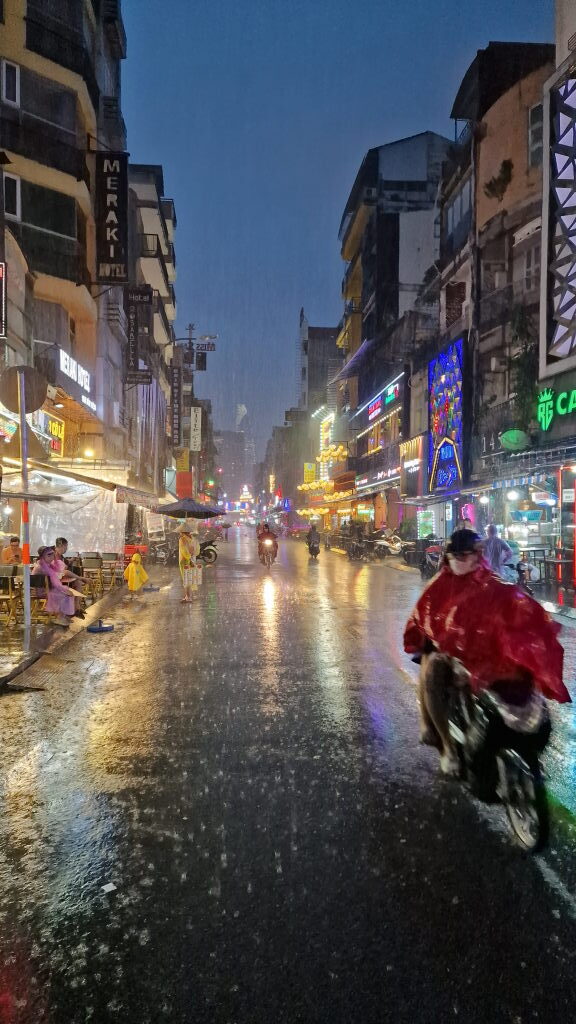 16:53 Uhr. Regen. HCMC macht keinen halben Spaß, wenn es regnet — es macht einen ganzen. Innerhalb von Minuten ist die Straße ein Fluss, die Mopeds werden zu roten Regenponcho-Geistern, und ich stehe irgendwo unter einem Dach und schaue zu. Es ist laut, nass, chaotisch. Es ist HCMC.