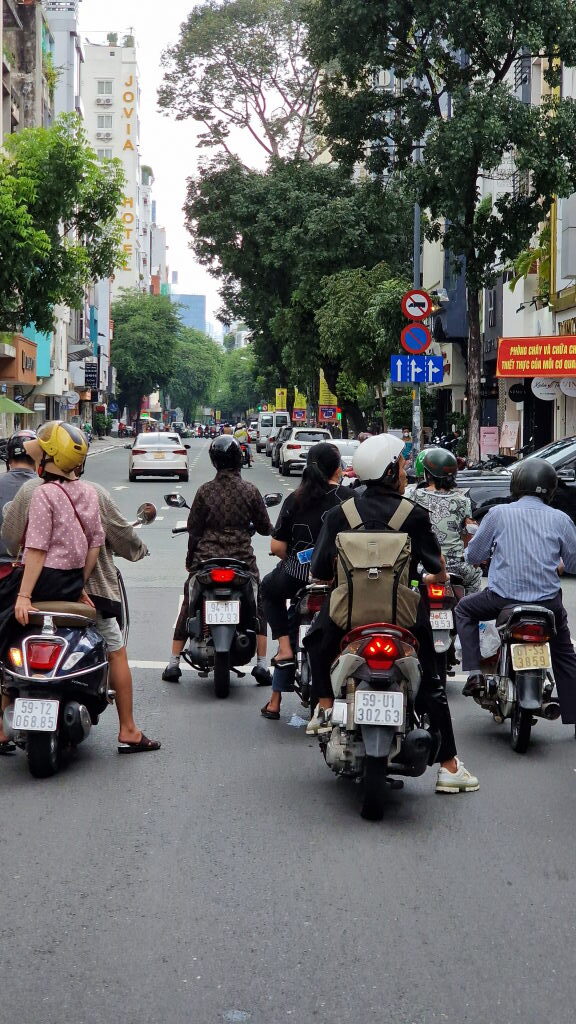 17:39 Uhr. Kreuzung. Der Regen ist kurz vorbei. Die Mopeds stehen an der Ampel — dicht, geduldig, und doch irgendwie bereit, jederzeit loszufahren. Die Straße ist ein Organismus. Man lernt, sich darin zu bewegen, oder man lernt, zuzuschauen. Beides ist okay.