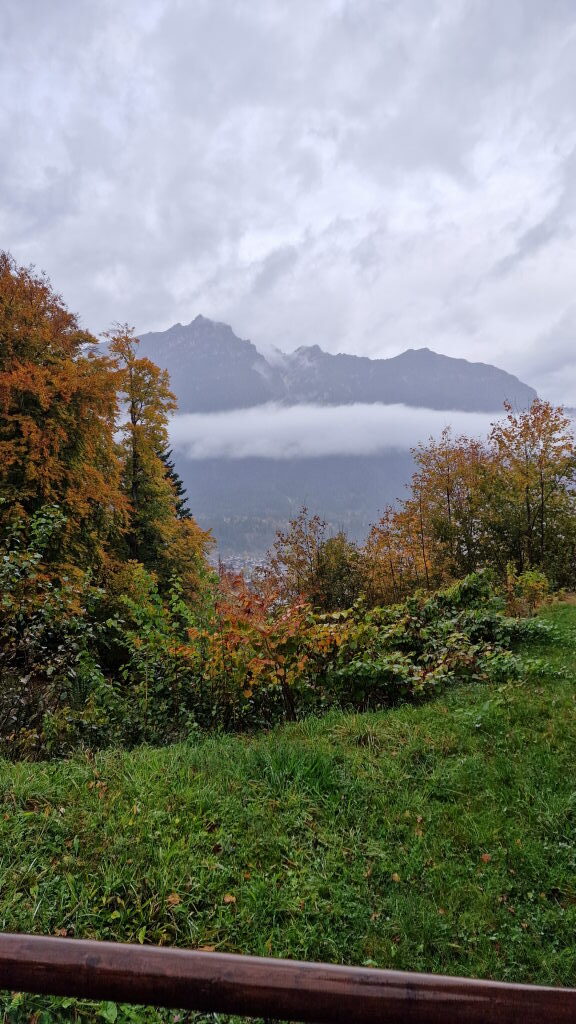 Unten in Garmisch empfängt einen eine andere Welt. Das Wetter hat auf Herbstregen umgestellt — nasse Kopfsteinpflaster, gelbe Blätter auf dem Boden, die Lüftlmalerei an den Fassaden glänzt feucht. Und trotzdem, oder vielleicht gerade deshalb: schön.