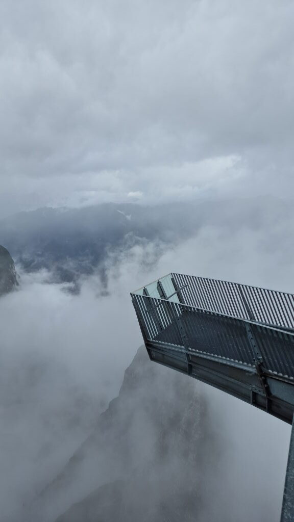 Der AlpspiX im Nebel — ein gespenstischer Balkon ins Nirgendwo. Man glaubt das Tal irgendwo da unten, mehr als man es sieht.