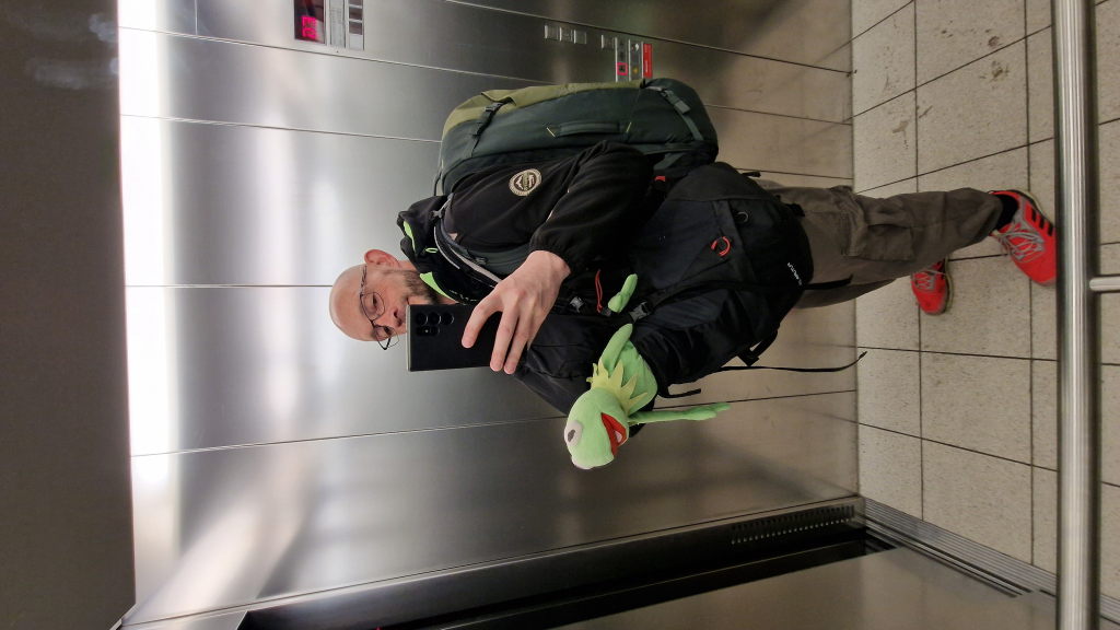 03:53 Uhr. Fahrstuhlspiegel. Rucksack auf dem Rücken, Kermit unterm Arm, Brille auf der Nase. Der Beginn jeder langen Reise sieht ungefähr so aus: man ist schon wach, obwohl man eigentlich noch schlafen sollte, und irgendwer im Spiegel grinst trotzdem.