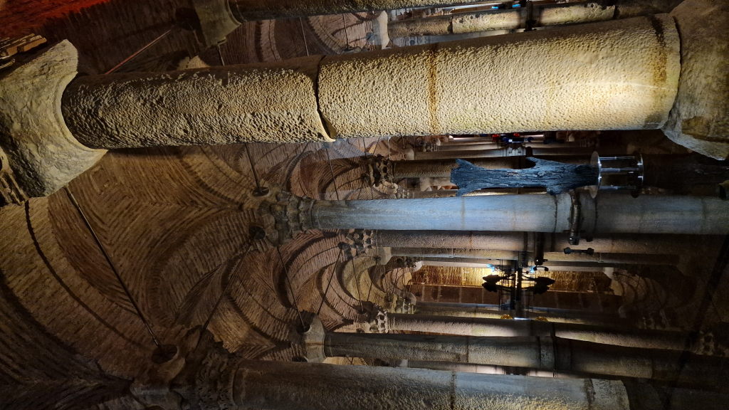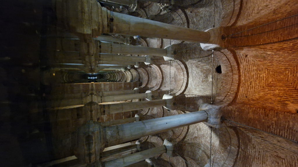 Die Basilika-Zisterne ist einer dieser Orte, die man gesehen haben muss — und die dann doch mehr sind als erwartet. Unter der Stadt, kühl, still, 336 Marmorsäulen die sich im Wasser spiegeln. Gebaut im 6. Jahrhundert, heute beleuchtet wie ein Konzertaal. Der Kontrast zur lauten Stadt oben ist komplett.