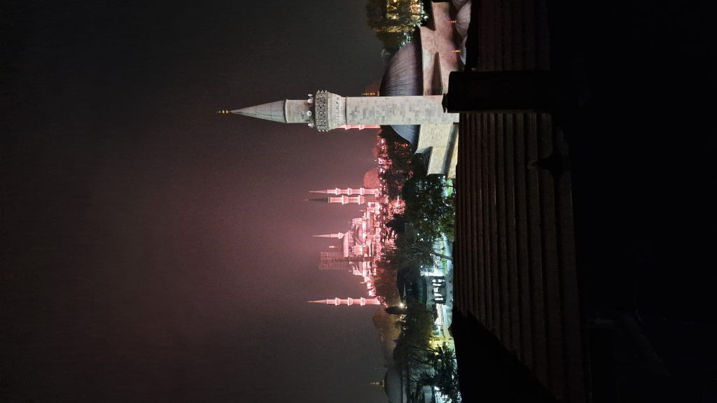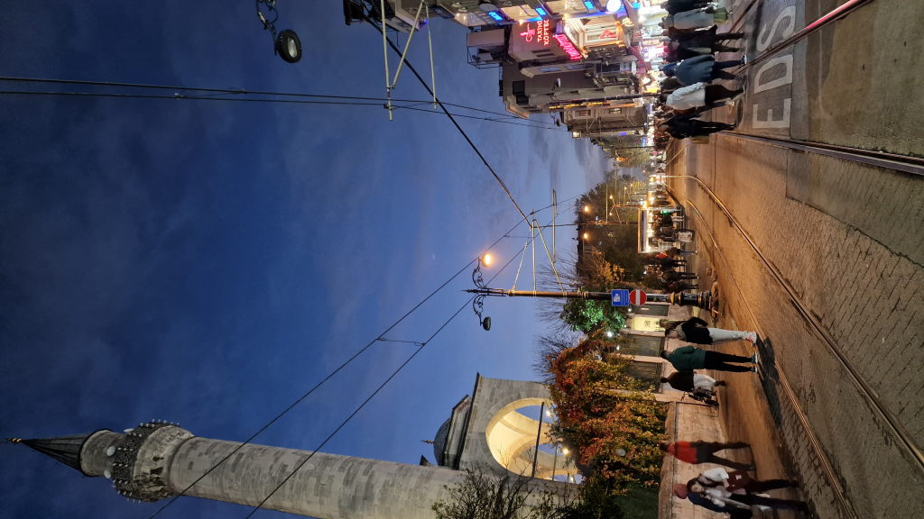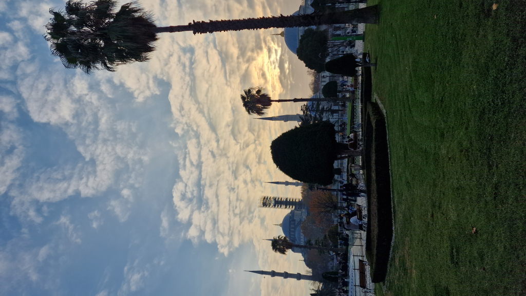 Danach: Sultanahmet. Die Blaue Moschee ist eingerüstet — natürlich. Das Baugerüst gehört inzwischen offenbar zur Silhouette dazu. Trotzdem: der Sonnenuntergang dahinter, die Palmen, der Muezzin in der Luft. Touristisch bis auf die Knochen, und trotzdem funktioniert es.