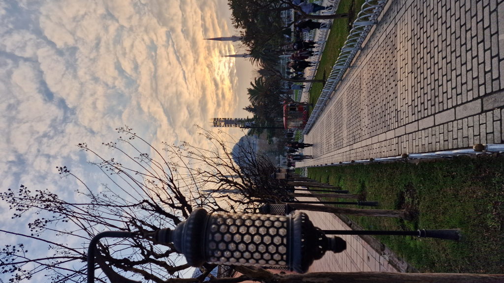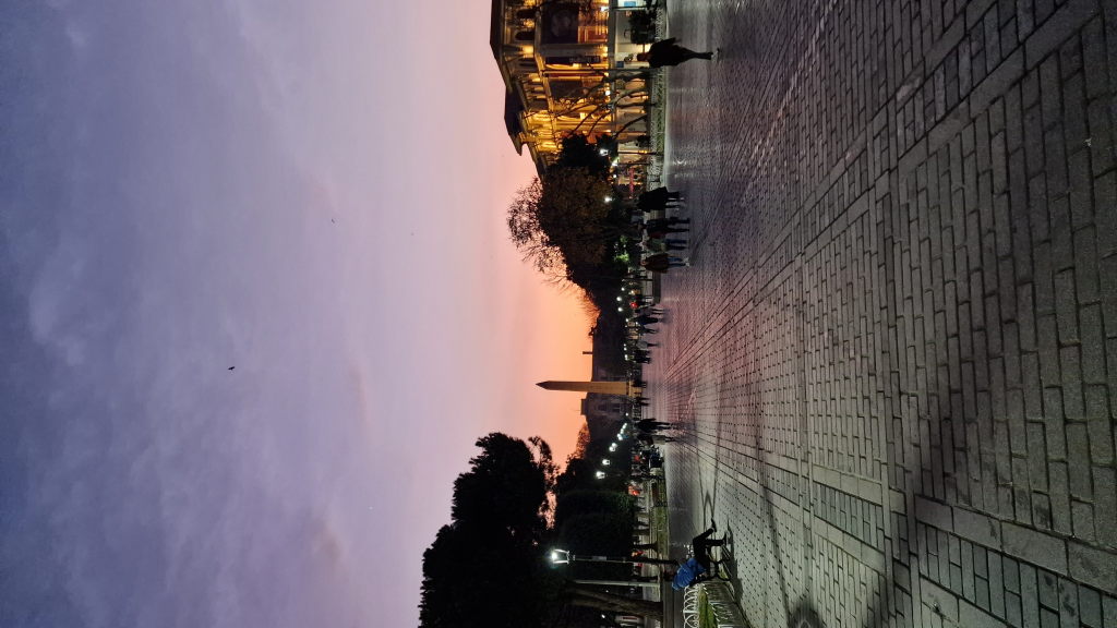 Danach: Sultanahmet-Platz bei Dämmerung. Der Obelisk steht seit 390 n. Chr. hier. Der Himmel ist pink. Die Menschen laufen durch. Manche schauen hoch, die meisten nicht.