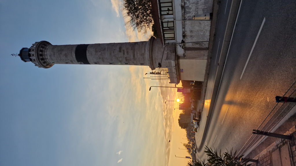 Ein Leuchtturm an der Küstenstraße, die Sonne direkt dahinter. Solche Momente passieren auf Reisen einfach — man läuft irgendwo lang, schaut auf, und das Licht macht genau das, was es soll.