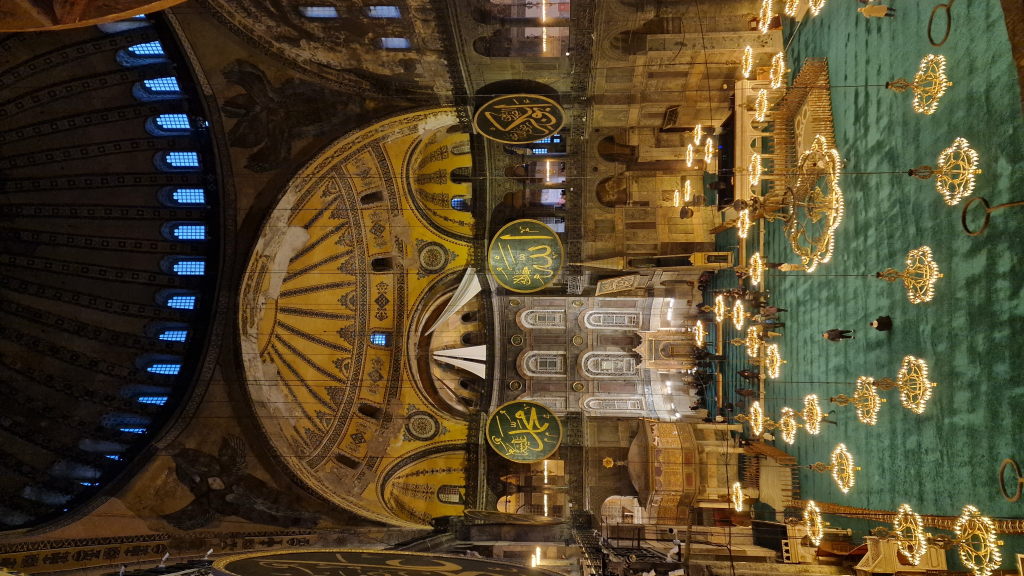 Die Hagia Sophia ist das, wofür man keine Worte findet — und trotzdem versucht man es. Kirche, Moschee, Museum, wieder Moschee. Die Kuppel schwebt. Die Kronleuchter hängen tief. Der grüne Teppich zieht sich durch alles. 1.500 Jahre schauen von oben rauf.