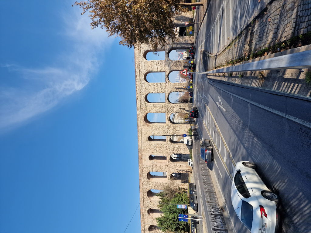 Das Valens-Aquädukt: römisch, 4. Jahrhundert, mitten in der Stadt — und der Verkehr fährt einfach drunter durch. Das ist Istanbul. Man baut nicht drum herum, man baut drunter durch. Oder drüber. Oder daneben. Die Geschichte stört den Alltag nicht, sie ist einfach Kulisse.