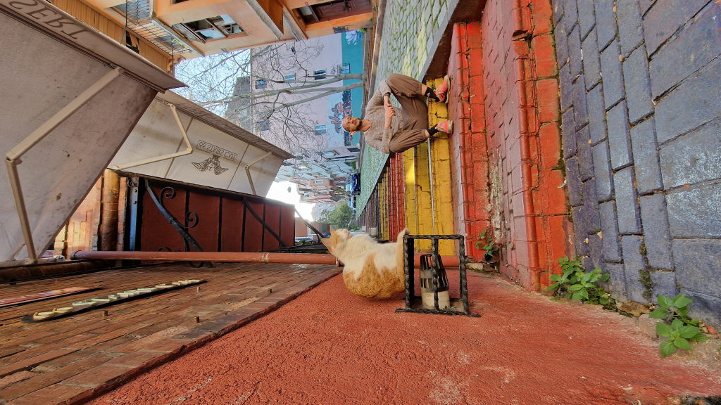 Spiegel-Selfie vor einem Hotel nahe dem Galata-Turm — drei Versionen von mir, alle gleichzeitig. Karaköy, die Regenschirm-Gasse: bunt, dekorativ, touristisch. Aber halt auch einfach schön.