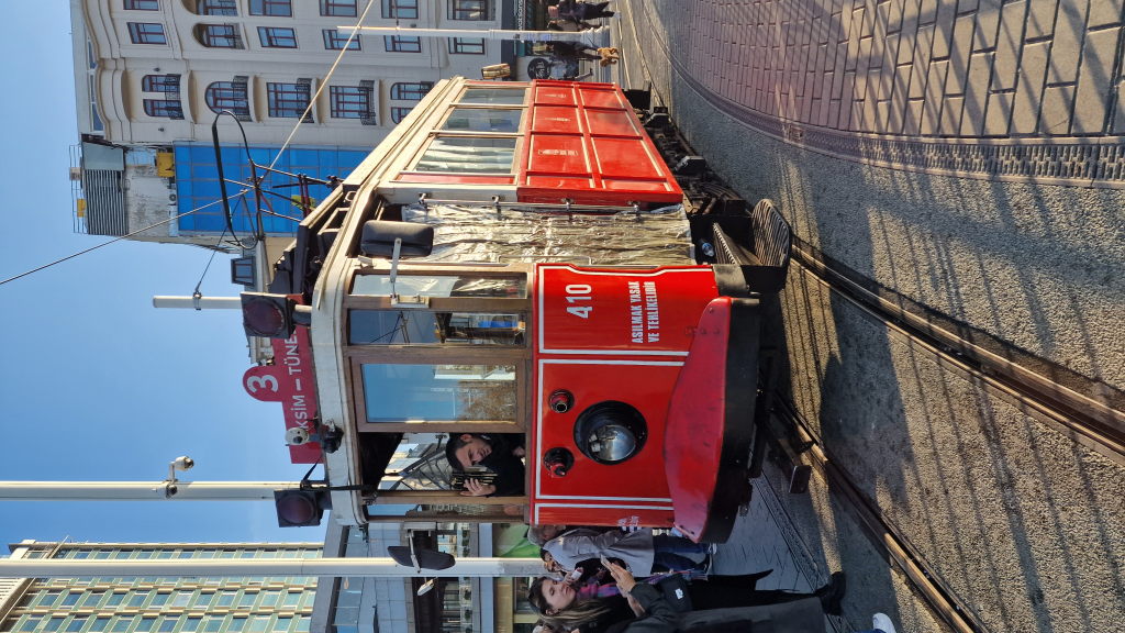 Taksim-Platz: die rote historische Straßenbahn fährt durch. Daneben steht ein Ferrari als Trafik-Polisi-Fahrzeug. Istanbul macht einfach was es will — und das ist auch gut so.