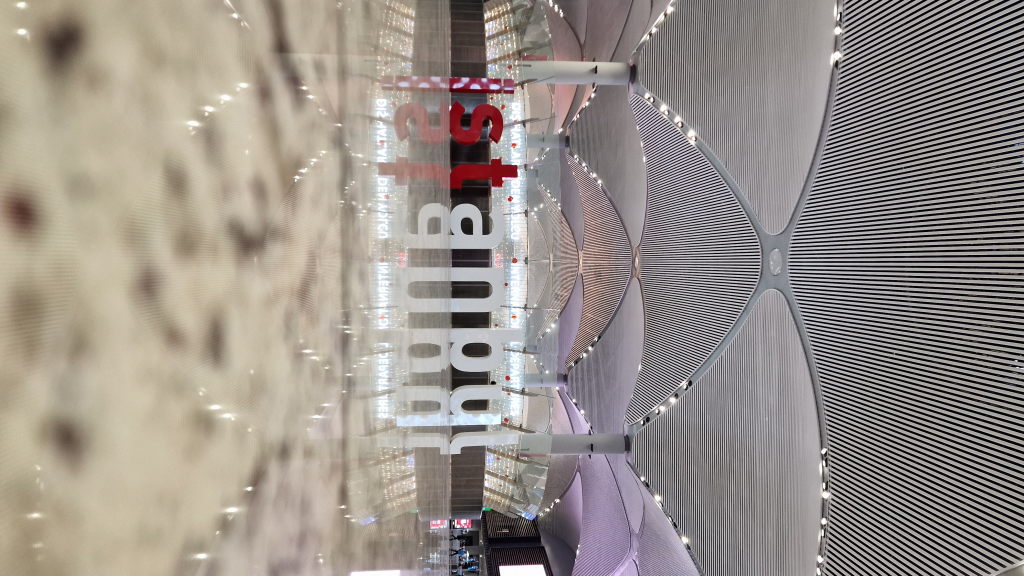 Der Istanbul Airport ist einer der größten der Welt — und er sieht es. Weite Hallen, geschwungene Decken, und auf dem Boden in riesigen Lettern: istanbul. Der Weg dahin von der Innenstadt: lang. Sehr lang. Aber das Terminal selbst ist beeindruckend. Ein letztes Foto, dann: Manila.