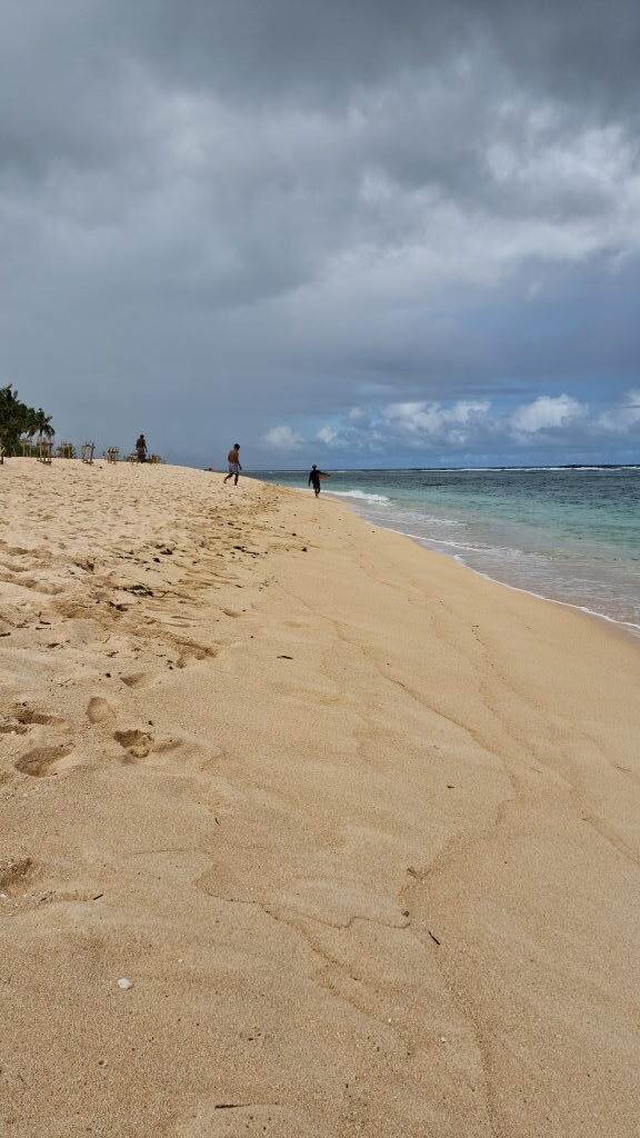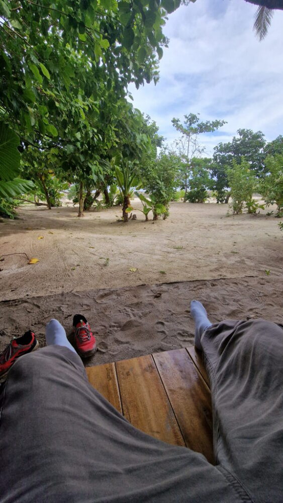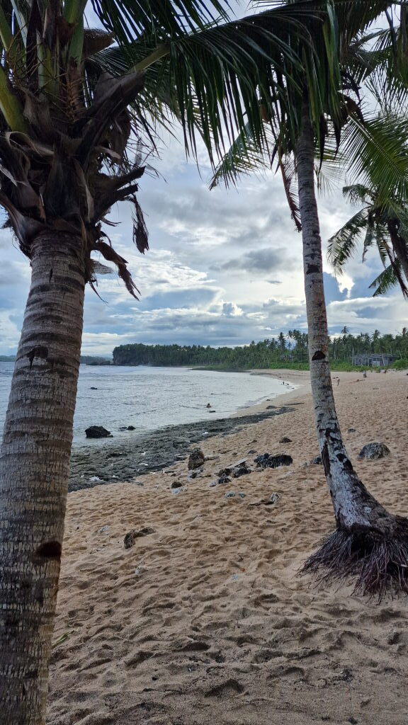 Der Bungalow direkt am Strand war genau das, was er sein sollte: einfach, nah am Wasser, mit Sand vor der Tür. Was er nicht hatte: verlässlichen Strom. Siargao hatte zu der Zeit einen weitgehenden Stromausfall auf der ganzen Insel — nur manche Restaurants und Resorts liefen mit Generatoren. Das bedeutete: Handy-Aufladen als taktische Entscheidung. Wo essen? Da wo Steckdosen sind. Wie lange bleiben? Solange der Akku es verlangt.