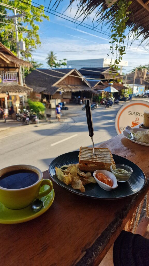 Das Siargao Coffee hatte genau das, was man auf einer Insel ohne Strom braucht: Kaffee, einen Generator, und einen Tisch mit Blick auf die Straße. Toastie mit Chips, schwarzer Kaffee, das Treiben des Ortes im Hintergrund. Das ist kein Café — das ist Lebensqualität.