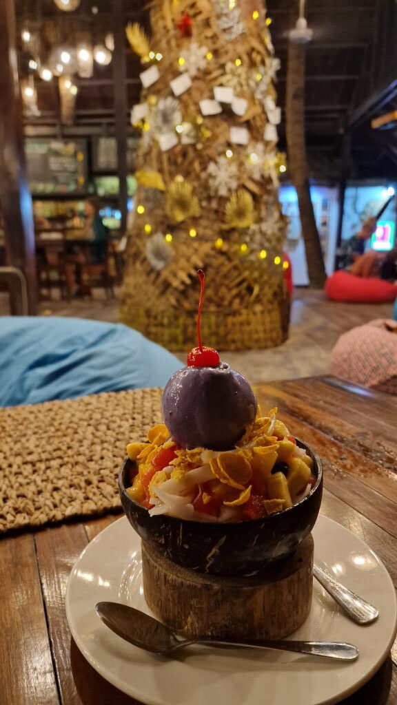 Dezember auf Siargao bedeutet: 30 Grad, Palmen — und trotzdem Weihnachten. Die Philippinen sind eines der wenigen Länder, in denen Weihnachten wirklich ernst genommen wird, auch wenn die Temperaturen nicht mitspielen. Das Restaurant hatte einen Weihnachtsbaum aufgestellt — aus geflochtenem Bambus und Palmenblättern, mit Lichterketten und Anhängern. Kermit war beeindruckt.