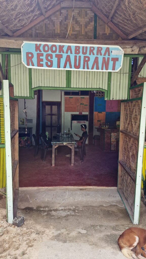 Mittagessen im Kookaburra Restaurant in Burgos — ein einfaches Lokal, Bambuswände, Hund vor der Tür, handgeschriebene Speisekarte. Chicken Stew mit Reis und Iced Coffee im Einmachglas. Günstig, gut, ehrlich. An der Wand ein Schild: „You’re eggstremely cute!“ Das Kookaburra weiß was es ist und macht da keinen Hehl draus.