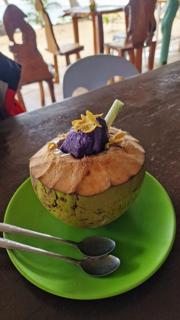 Halo-Halo ist das philippinische Nationaldessert: Crushed Ice, Kokosnussmilch, bunte Zutaten, und ganz oben drauf eine Kugel Ube-Eis — lila Süßkartoffeleis, unverkennbar in Farbe und Geschmack. Hier serviert in einer halben Kokosnuss. Man isst es, bevor es schmilzt. Das geht schnell.