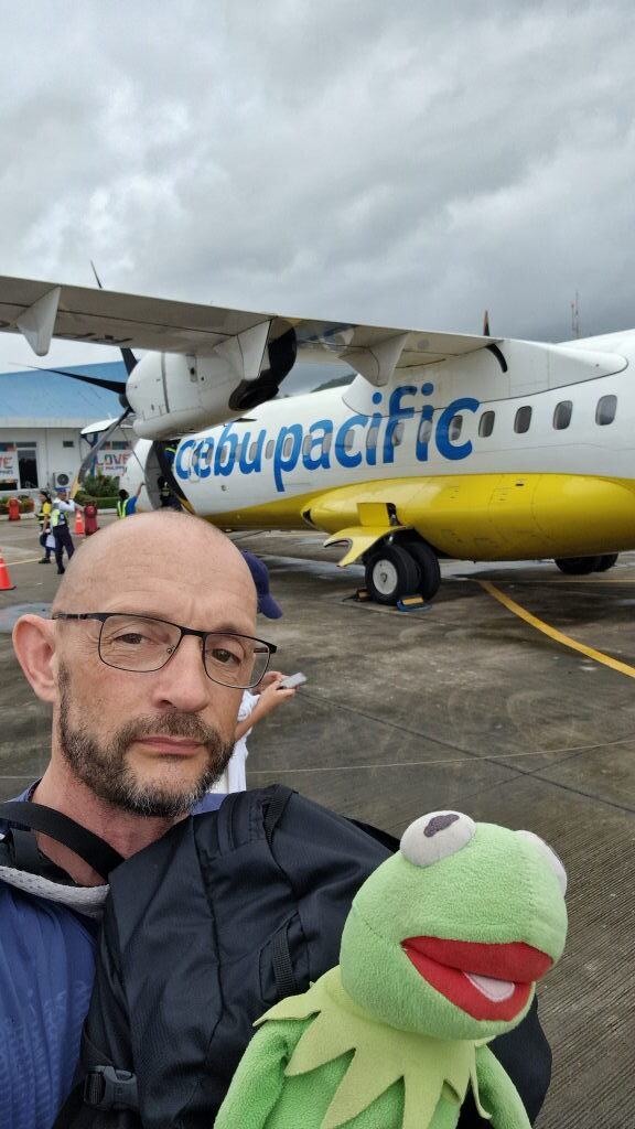 Abreise. Cebu Pacific, ein kleiner ATR-Propeller-Flieger, direkt auf dem Rollfeld. Kermit hat das Foto verlangt. Der Flieger sah aus als wäre er aus einem anderen Jahrzehnt — er flog trotzdem.