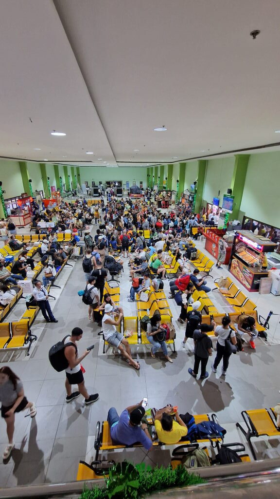 Cebu war kein Ziel — es war eine Durchreise. Flieger landet, Gepäck abholen, raus aus dem Terminal, Motorrad-Taxi zum Hafen. Der Fährhafen in Cebu-City ist das philippinische Gegenteil von Siargao: laut, voll, chaotisch, lebendig. Hunderte Menschen, gelbe Plastikstühle, Stimmengewirr.